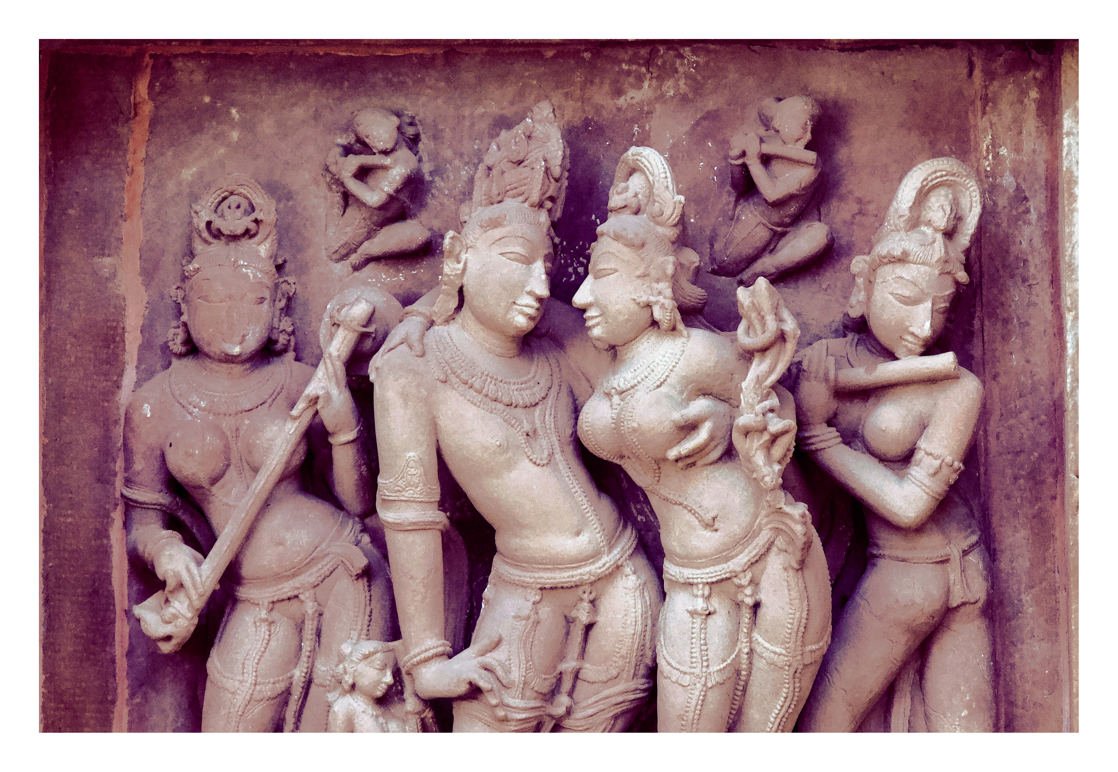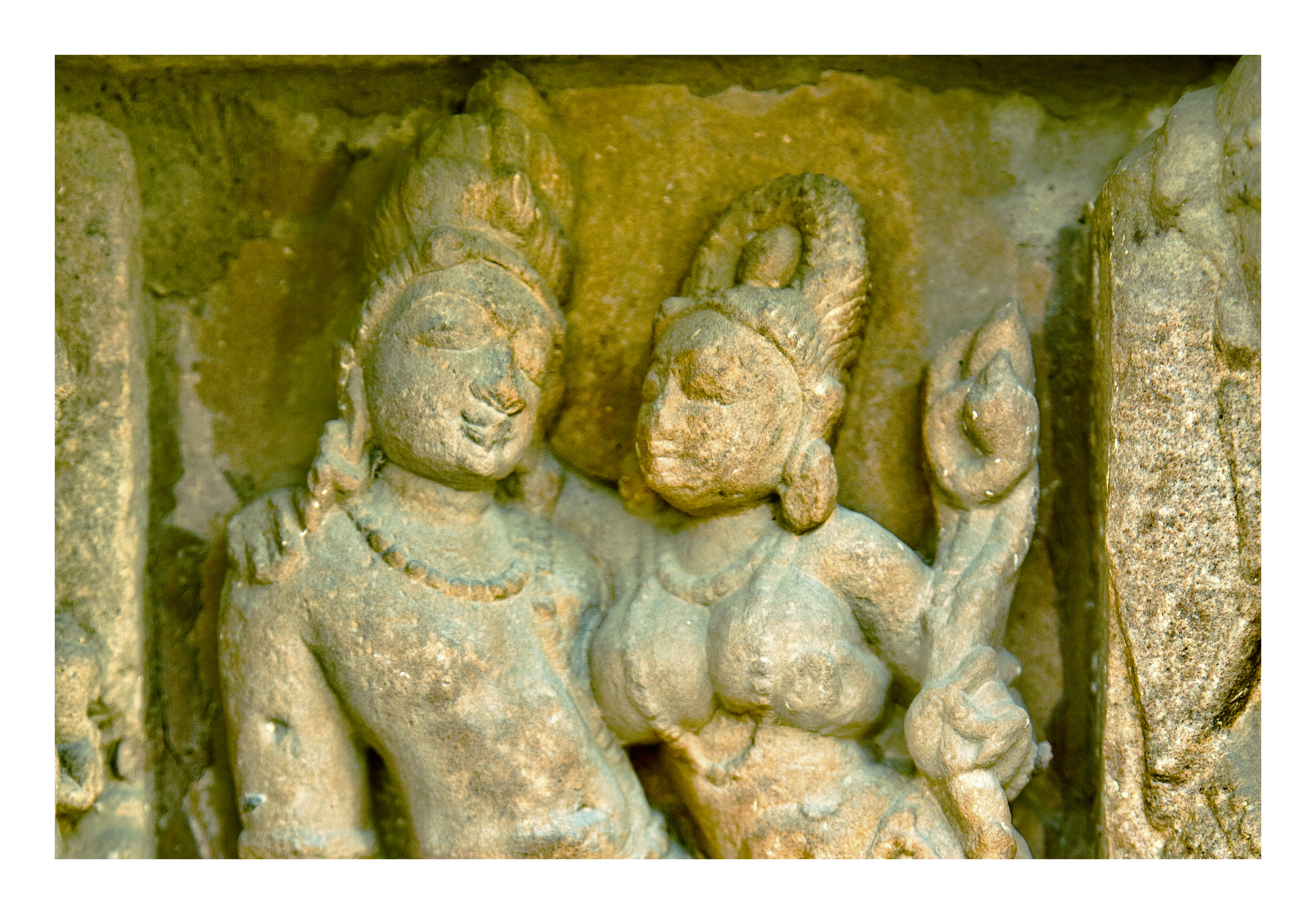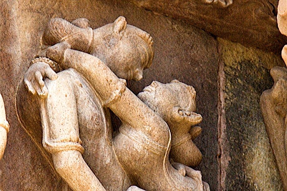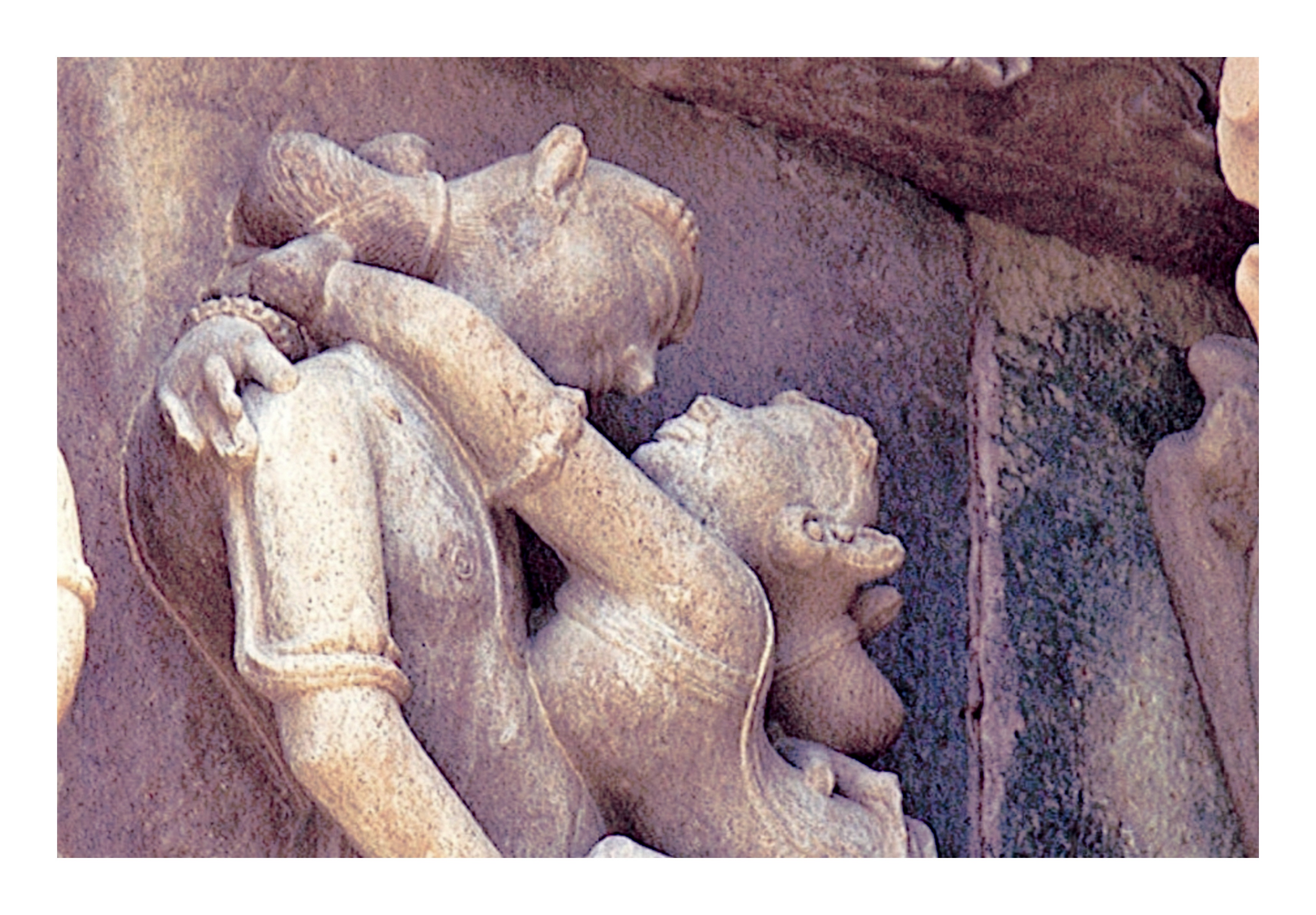 The photograph captures a detailed stone sculpture from the Khajuraho Temples, showcasing an intimate embrace between two figures. The intricately...