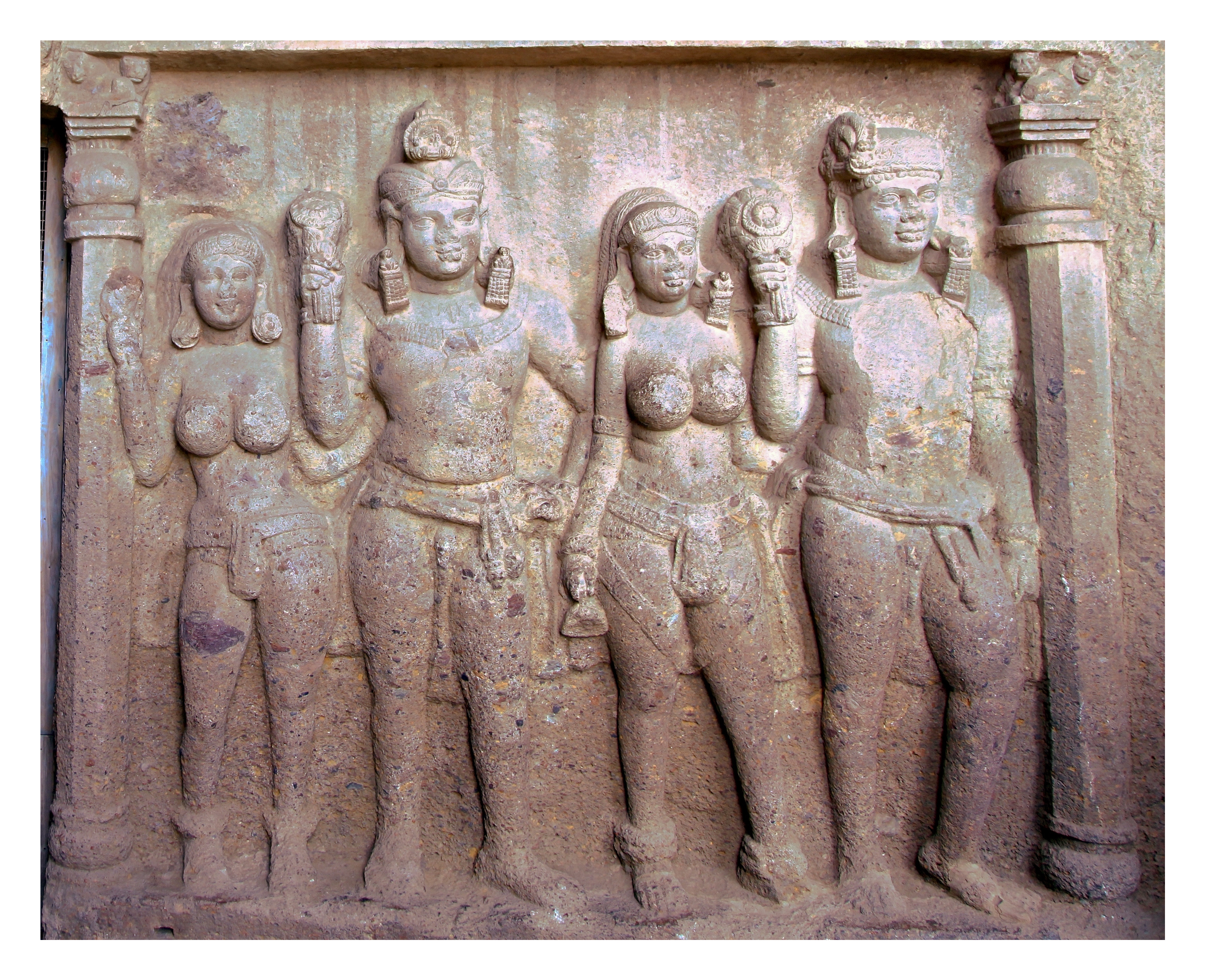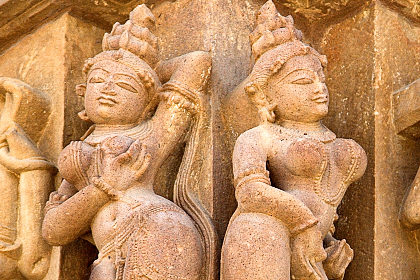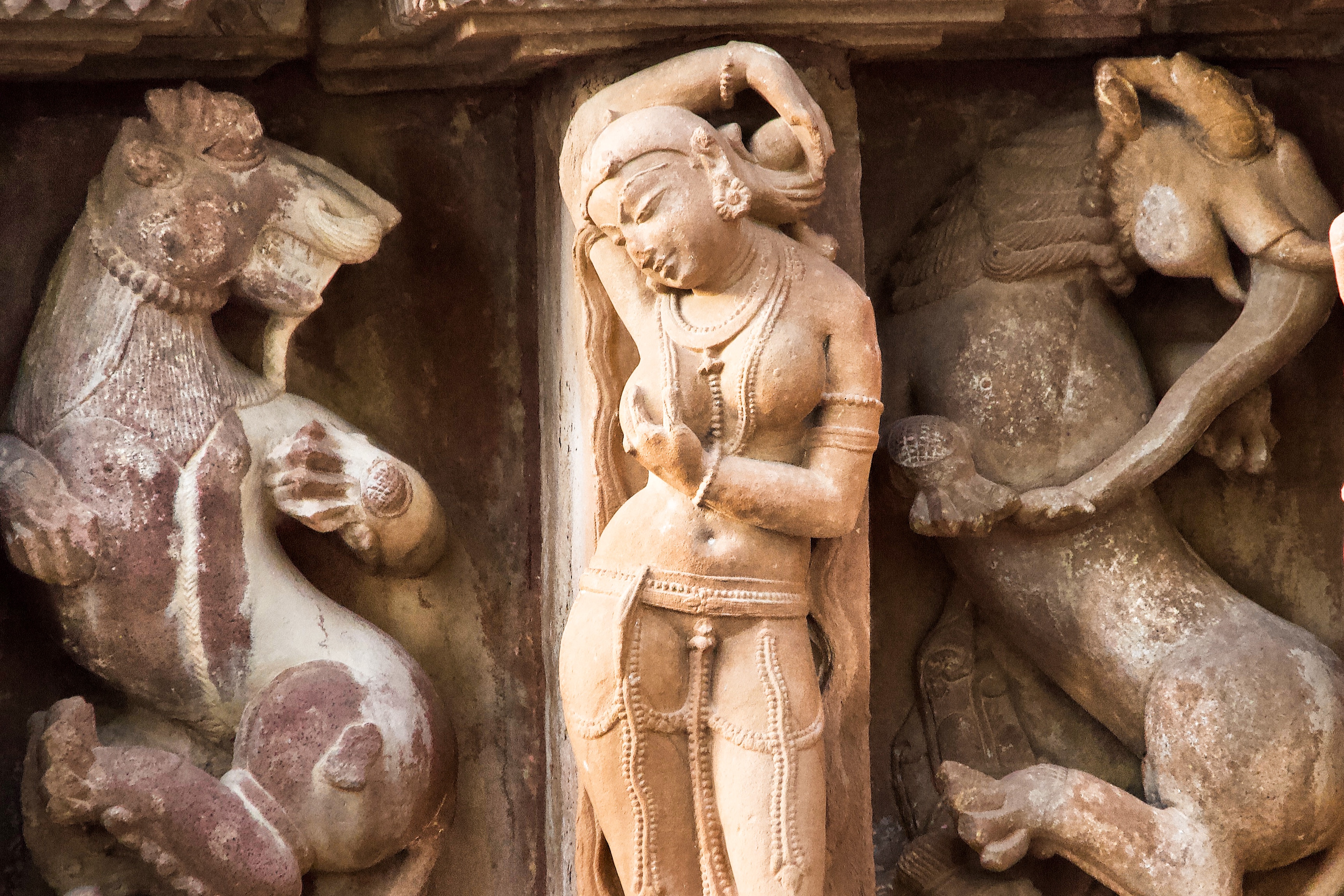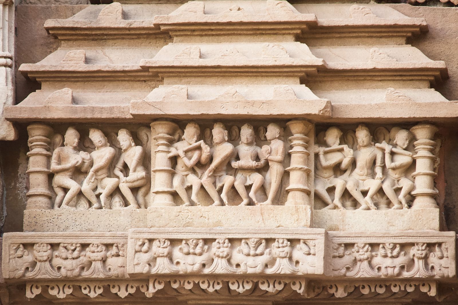 The photograph showcases a section of the intricate stone carvings on the exterior of the Khajuraho Temples, built between 950...