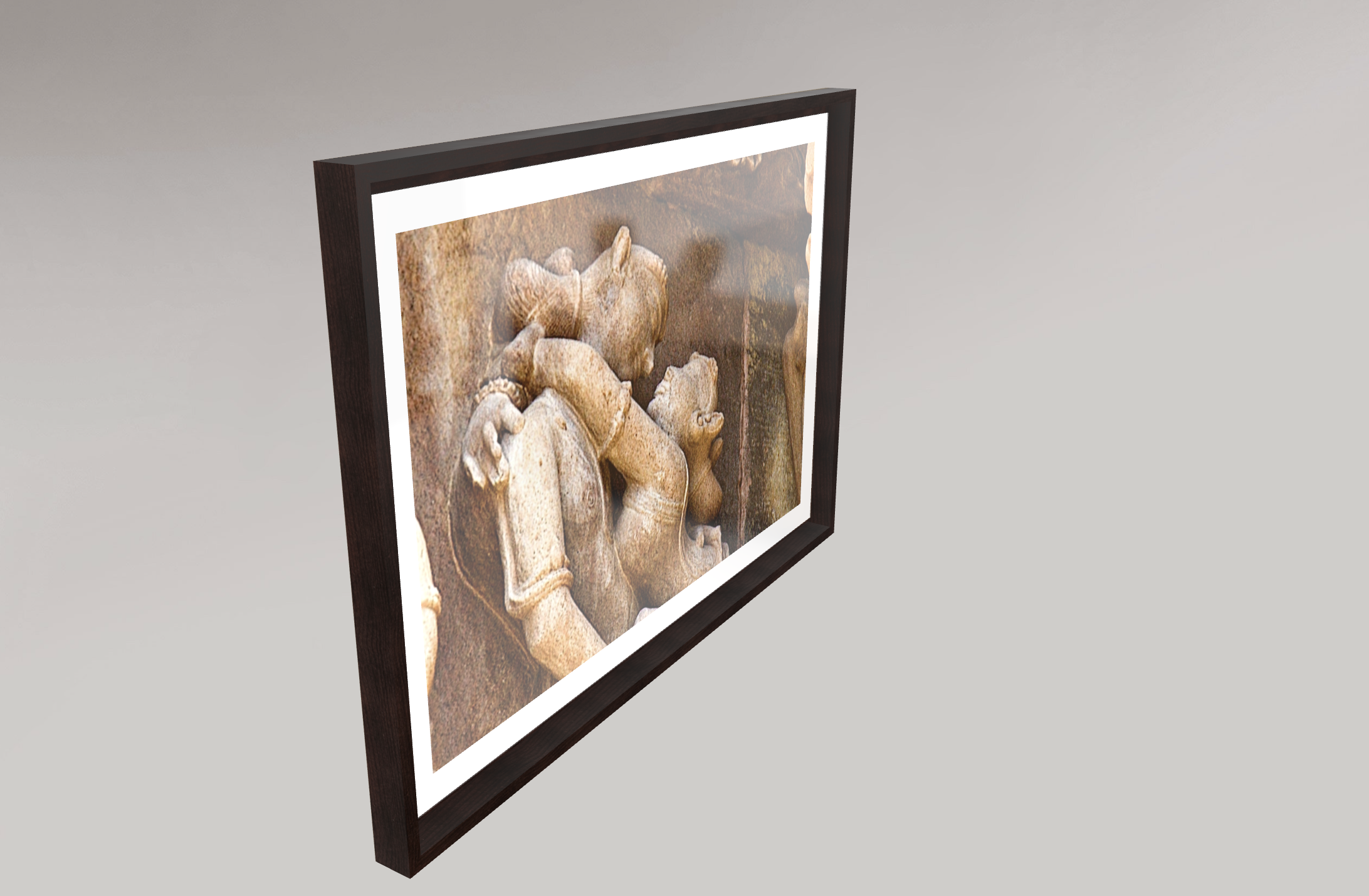 The framed photograph captures the mesmerizing allure of a Khajuraho temple sculpture, featuring intricately carved stone figures in a graceful,...